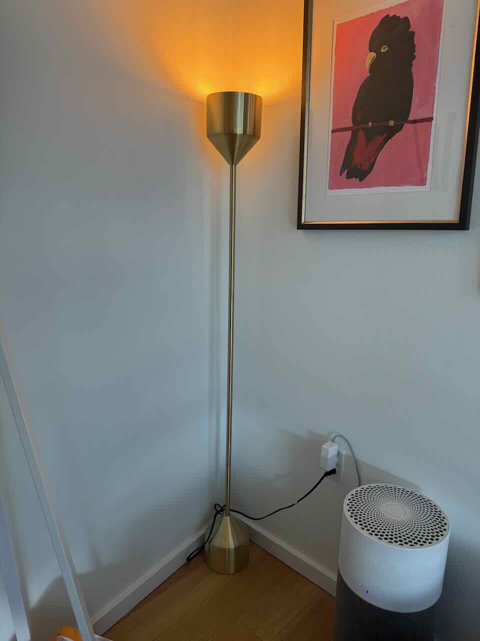 Article Barbell Floor Lamp in brass finish. Scandinavian style with slim profile. Metal base and shade. Height 65 inches Diameter 6 inches. Shade 7 inches high by 6 inches diameter. Base 7 inches high by 6 inches diameter. Weight 11 lbs. E26 4W LED bulb included. Steel plastic materials. Simple well-balanced design adds glam touch to your home. Sophisticated metallic finish. Google Article Barbell Floor Lamp for more information.